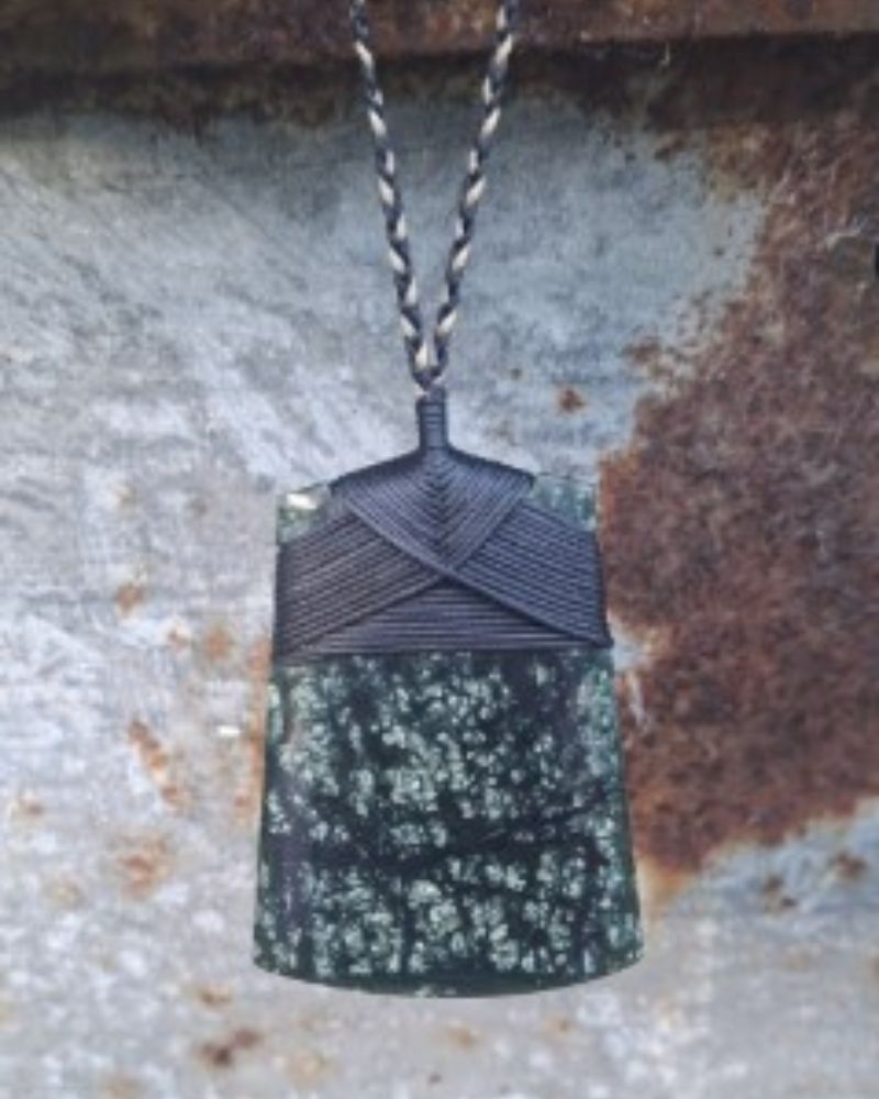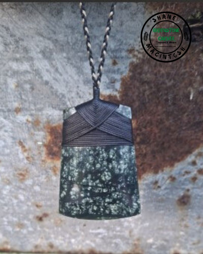 This Wide Serpentine Toki is carved from Serpentine Pounamu with its own unique mottled patterning within the stone and has been lashed with a fully adjustable trio plaited waxed cord & then completed with a polished finish