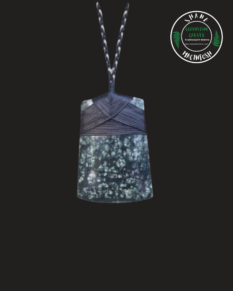 This Wide Serpentine Toki is carved from Serpentine Pounamu with its own unique mottled patterning within the stone and has been lashed with a fully adjustable trio plaited waxed cord & then completed with a polished finish